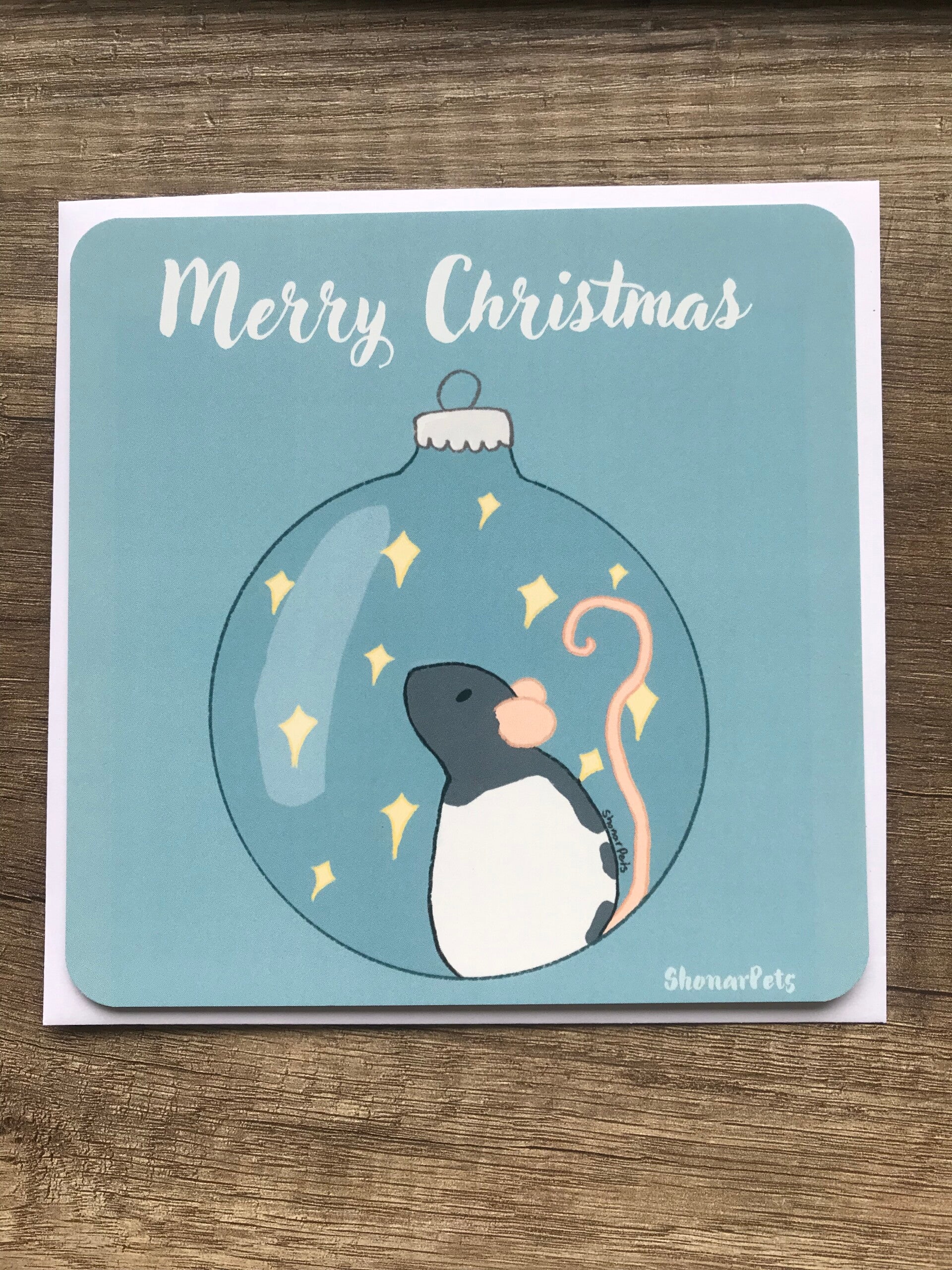 Deze rattige kerst kaarten komen in 3 kleuren met ieders een ander ratje. Deze kaart komt ook in vierkante en ronde hoeken en heeft ook standaard een envelop bij iedere kaart. de kaart is 15,2 x 15,2cm groot.